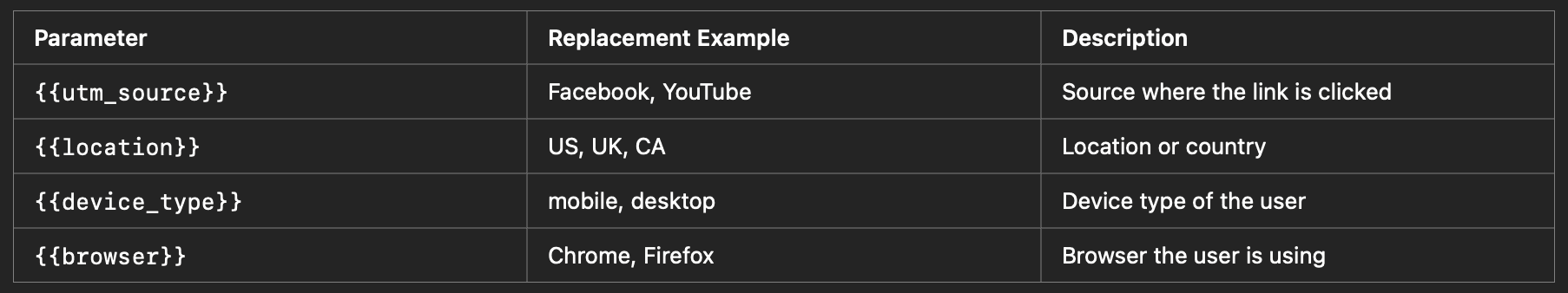 With dynamic UTM parameters, you no longer have to manually set the UTM values for each link. Instead, you can insert placeholders, which are dynamically filled when the link is accessed. Here’s a quick rundown of the most important dynamic URL parameters: