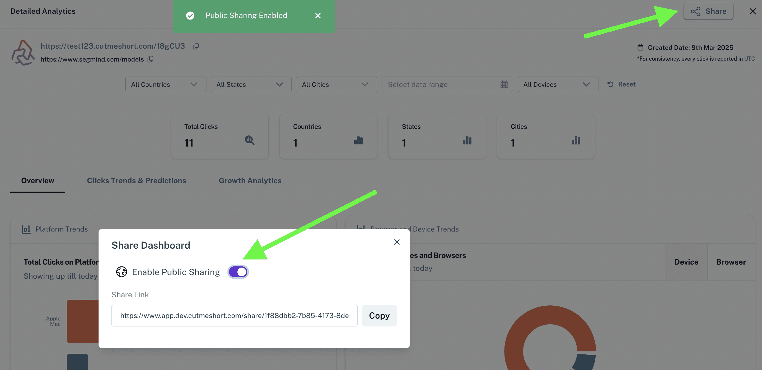 Head to your Analytics page on CutMe Short, enable Public Sharing, and experience the convenience of effortless analytics collaboration.