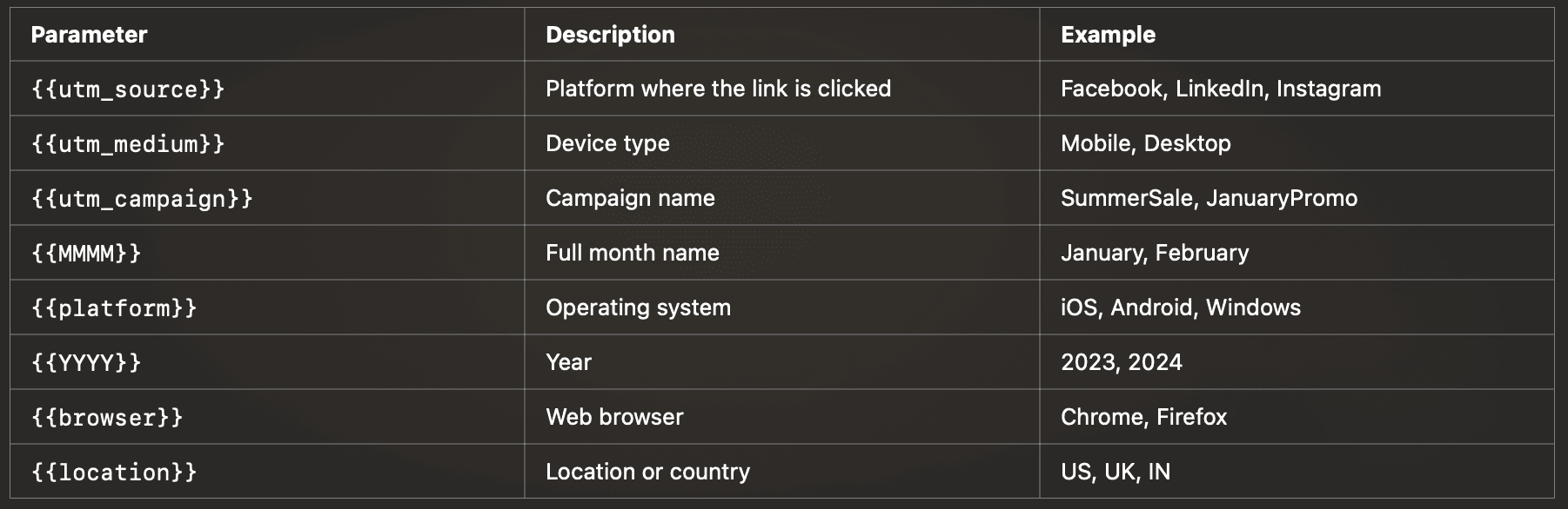 Dynamic UTM parameters are placeholders that automatically fill in specific values based on the user’s environment when the link is clicked. Here’s an example: