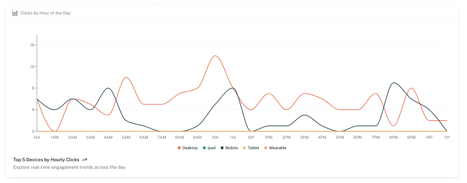 Hourly Clicks Trend: This metric helps you identify peak engagement times for each device type, allowing you to tailor your content strategy and optimize campaigns for specific platforms, whether it's mobile, desktop, tablet, or other devices.