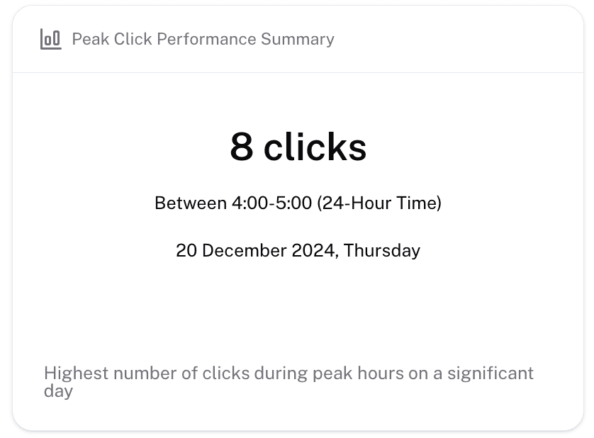 Peak Clicks Performance Summary: This metric is crucial for optimizing content distribution and scheduling marketing campaigns to maximize reach and impact. By analyzing this data, you can replicate success by targeting similar time frames in future strategies.