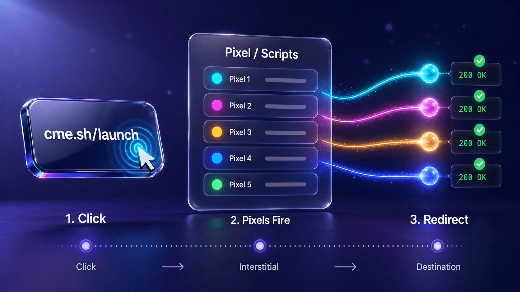 When someone clicks a CutMe Short link with pixels attached, the request is served a tiny HTML interstitial page that: