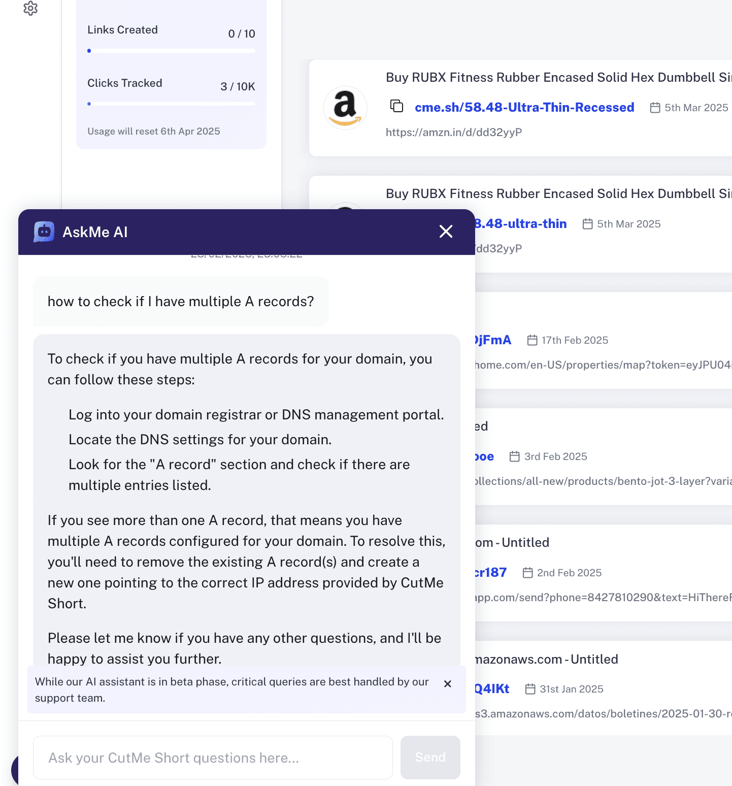 We are thrilled to announce the launch of Ask AI, an automated AI-powered support system within CutMe Short. With this new feature, users can get instant answers to their questions without having to wait for human support. Whether you're setting up a branded link, connecting a custom domain, troubleshooting an issue, or exploring QR code features, Ask AI is here to assist you 24/7.