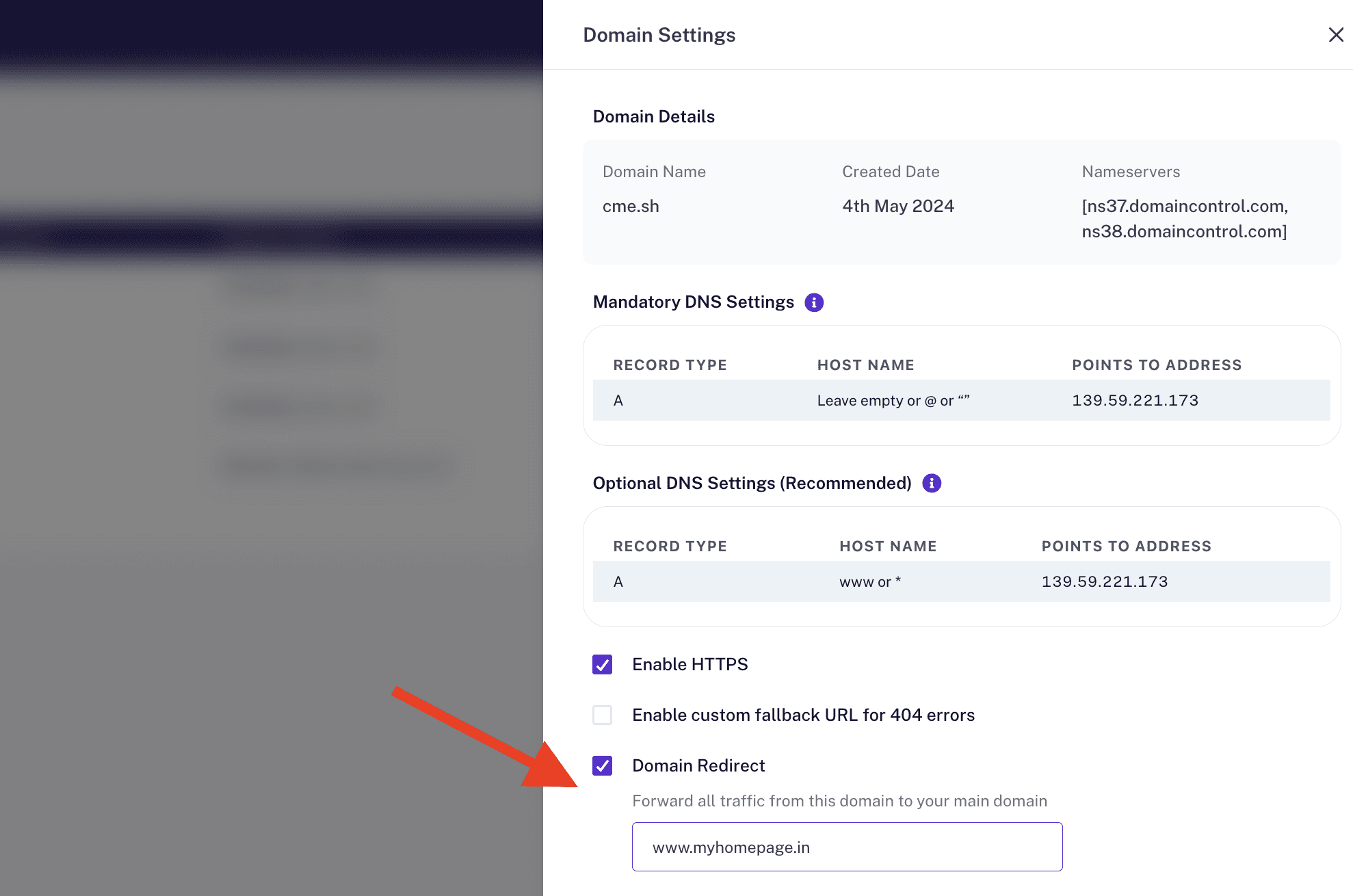 3. Tick the “Domain Redirect” option.
